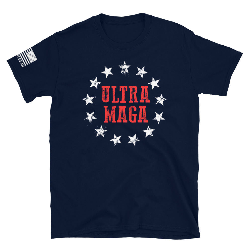 Show the world your patriotism and love for the America with this ULTRA MAGA Red and White 13 Stars Patriotic graphic tee. Featuring a "huge" American style text surround by a red rectangle and stars that screams I am a 'Merica loving patriot. The right sleeve also includes the forward assaulting American Flag with the text Gunner Gear. This shirt would be a patriotic shirt for men on the 4th of July, to wear around libs, bbq, a party, or just spending time with friends and family.
